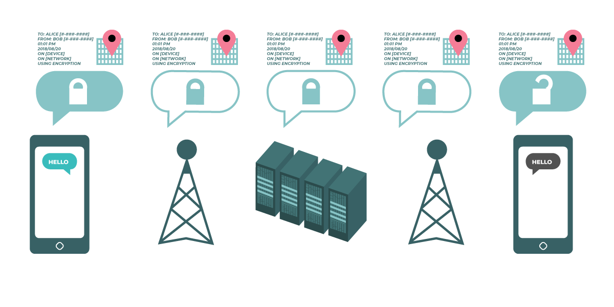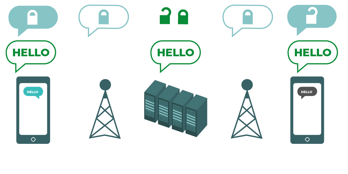 ဒီပုံကားချပ်ကတော့ သယ်ယူ ပို့ဆောင်ရေးအလွှာတွင်ကုဒ်ဖြင့်ပြောင်းလဲခြင်းကို သရုပ်ဖော်ထား တာဖြစ်ပါတယ်။ ဘယ်ဘက်က စမတ်ဖုန်းကနေ “ဟဲလို” ဆိုတဲ့ ကုဒ်ဖြင့်ပြောင်းလဲထားခြင်း မရှိတဲ့ အစိမ်းရောင်မက်ဆေ့ချ်ကို ပို့လိုက်ပါတယ်။ အဲဒီမက်ဆေ့ချ်ကို ကုဒ်နဲ့ပြောင်းလဲပြီး ဖုန်းတာဝါတိုင်ဆီ ထပ်ပို့လိုက်ပါတယ်။ ဒီလိုပို့နေစဉ်မှာ ကုမ္ပဏီဆာဗာတွေဆီရောက်ရင် မက်ဆေ့ချ်ကို ကုဒ်နဲ့ပြောင်းလဲတာကိုပြန်ဖြည်  decrypt မယ်၊ ပြီးတာနဲ့ ပြန်ပြီးကုဒ်နဲ့ပြောင်းလဲခြင်းကို ထပ်လုပ်ပေးပြီး နောက်ဖုန်းတာဝါတိုင်တစ်ခုဆီ မက်ဆေ့ချ်ကိုပို့ပေးမယ်။ နောက်ဆုံးမှာတော့ လက်ခံရရှိသူက ကုဒ်နဲ့ပြောင်းလဲထားတဲ့မက်ဆေ့ချ်ကိုရမယ်။ အဲဒါကိုပြန်ဖြည်လိုက်တဲ့ အခါမှာတော့ “ဟဲလို” လို့ဖတ်လို့ရပြီပေါ့။