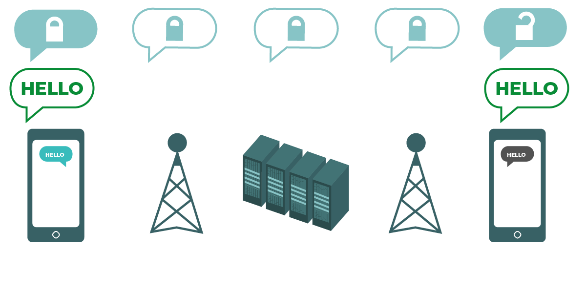 ဒီပုံကားချပ်က အစ-အဆုံးကုဒ်ဖြင့်ပြောင်းလဲခြင်းကို ဆွဲပြထားတာပါ။ ဘယ်ဘက်က စမတ်ဖုန်း ကနေ ကုဒ်နဲ့ပြောင်းလဲမထားတဲ့ “ဟဲလို”ဆိုတဲ့အစိမ်းရောင်မက်ဆေ့ချ်ကို ပို့လိုက်ပါတယ်။ အဲဒီ မက့်ဆေ့ချ်ကို ကုဒ်နဲ့ပြောင်းလဲပြီး ဖုန်းတာဝါနဲ့ ကုမ္ပဏီတာဝါတွေကိုဖြတ်စီးစေပါတယ်။ နောက်ဆုံး မှာတော့ ကုဒ်နဲ့ပြောင်းလဲထားတဲ့မက်ဆေ့ချ်က လက်ခံသူရဲ့ စမတ်ဖုန်းကို ရောက်ရှိသွားတဲ့အခါမှ ပြန်ဖြည်ပေးပြီး “ဟဲလို” လို့ မြင်ရပါမယ်။ သယ်ယူပို့ဆောင်ရေးအလွှာတွင် ကုဒ်ဖြင့်ပြောင်းလဲခြင်း နည်းလမ်းနဲ့ ကွာခြားတာတစ်ခုကတော့ သင့် ISP ဆာဗာတွေမှာ မက်ဆေ့ချ်ကို ပြန်ဖြည်လို့  decrypt လို့မရနိုင်ပါဘူး။ စမှတ်နဲ့ ဆုံးမှတ်ဖြစ်တဲ့ ပေးပို့သူနဲ့ လက်ခံသူနှစ်ဦးမှာသာ ပြန်ဖြည်နိုင်တဲ့သော့တွေရှိပါတယ်။